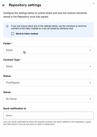 Before sending for signature, you have the option to send the the contract, once signed, to either the Inbox or a specific folder within the Repository. Once ready, click 'Send to Adobe Sign' at the bottom of the panel: