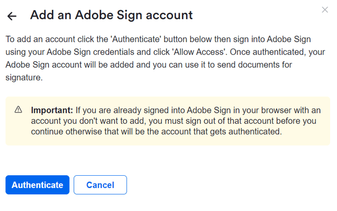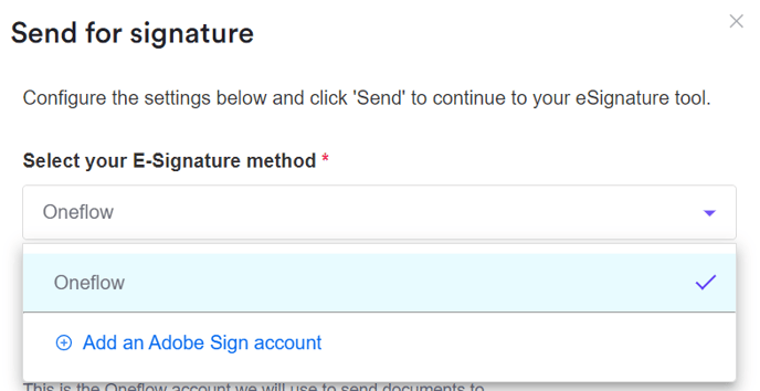 From the Send for signature panel, select 'Add an Adobe Sign account' from the dropdown: