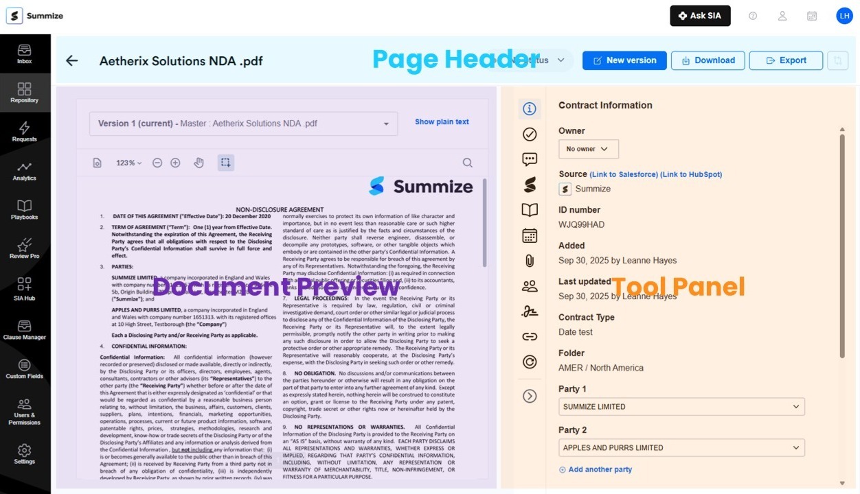 Along the top of the UI is the page header which contains the name of the contract, the status indicator and key actions such as New Version, Download and Export.