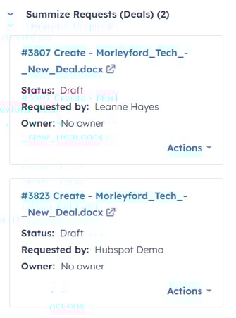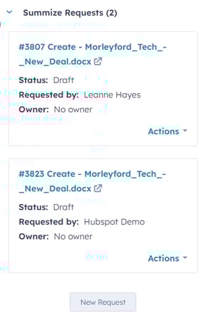Summize Requests – Requests attached to this entity. Available on Contacts, Companies and Deals. This allows a user to generate a new Request, or view existing Requests that were generated against the entity.
