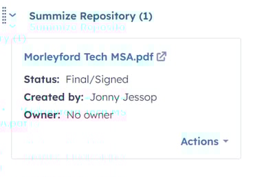 Summize Repository – Repository items attached to this entity, or items attached to a Request that has completed the signature workflow. Available on Contacts, Companies and Deals. This allows users to view any signed contracts related to the entity.