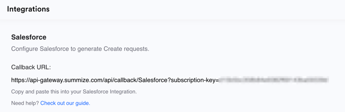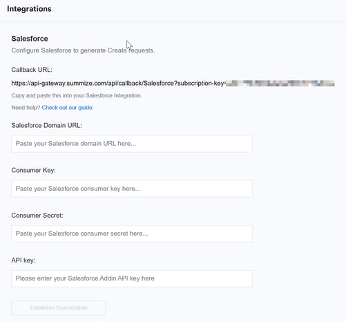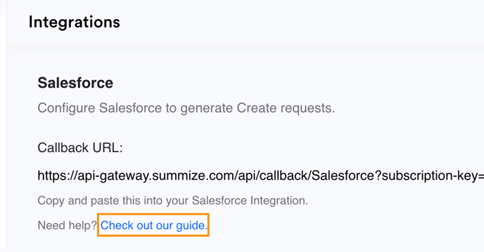 Throughout this guide, you will be directed at different stages to the Settings > Integrations page on the Summize web app. At the top of that page, you should see a section for Salesforce. If you cannot see the Salesforce section, it will need to be enabled on our side. Contact us to enable it.