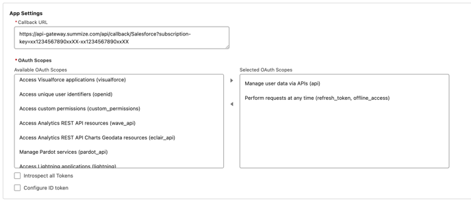 - Select the following options in the 'OAuth Scopes' multi-select picklist by moving them from the left to the right panel: