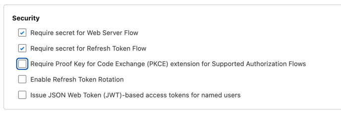 - In the 'Security' sub-section, untick 'Require Proof Key for Code Exchange (PKCE) extension for Supported Authorization Flows'