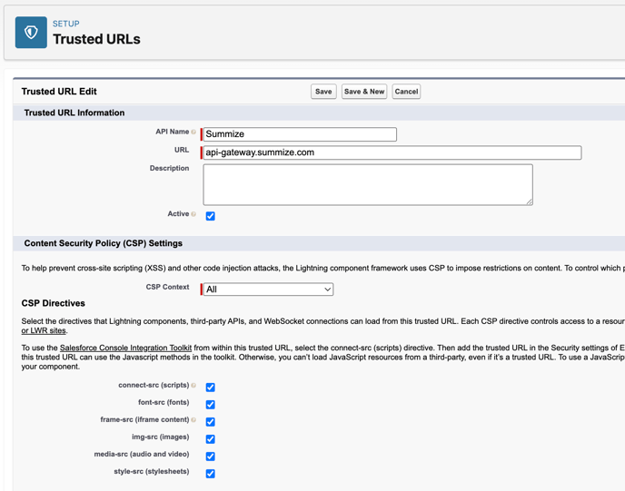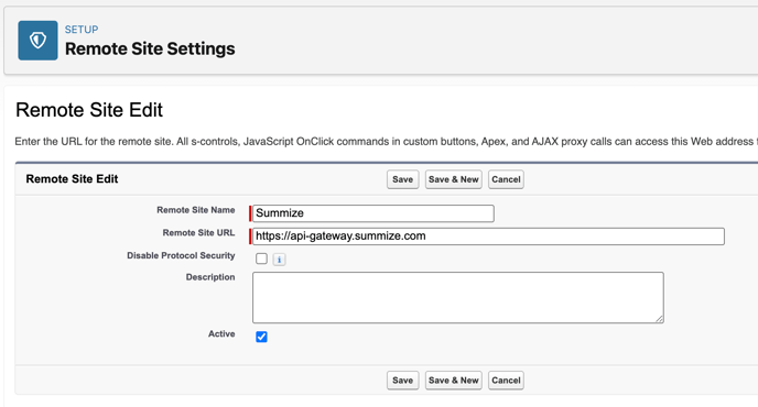 - Remote Site URL: Go to Settings > Integations on the Summize web app, navigate to Salesforce and click 'Check out our guide'. Scroll to the bottom of the pop-up and copy the value next to 'Summize API Endpoint - note, there is no trailing slash. For reference , the values for each of the datacentres are below: