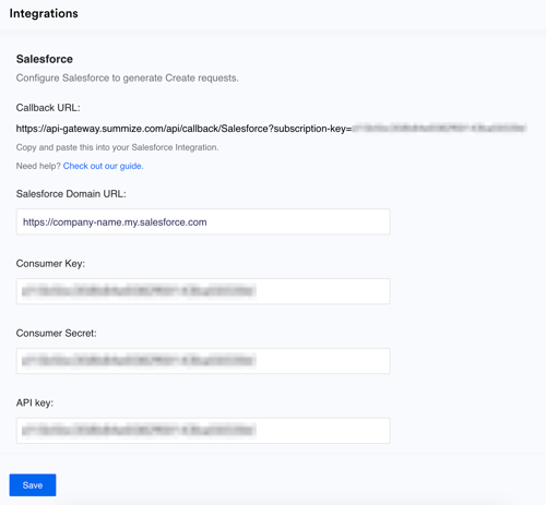 In the Summize web app, go to Settings > Integrations. Click the “Salesforce” section and paste in the following values: