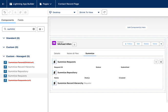 To start using Summize in Salesforce, navigate to a Lightning Record Page for an object that requires the app (Accounts and/or Opportunities), click 'Edit Page', and drag the required Summize widgets from the Custom section at the bottom of the left hand panel.