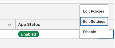 - Navigate back to the External Client App created in Step 2. From the table row action dropdown, select 'Edit Settings'.