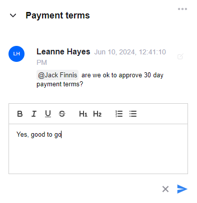 Task notes: Under the ellipses menu, add an update to a task via the 'Add note' button. Use this to update other stakeholders on task status whilst it's still pending.