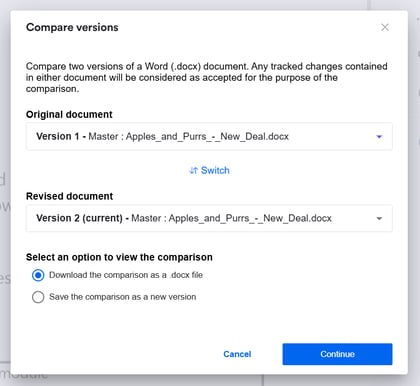 When comparing two docx files in a Request, you can now save that comparison document as a new version on the Request, making it more easily accessible by other members of the team.