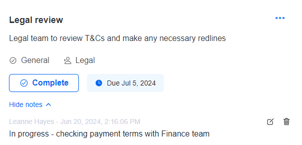 Tasks for Repository contracts allow legal teams or contract owners delegate work for things like renewals, payments, renegotiations or other post-signature obligations and milestones.