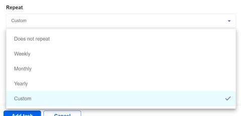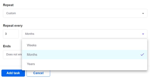 - Select the appropriate option for your task. For weekly, monthly or yearly schedules, the task will repeat on the same day of the week/month/year, until the end date. For custom schedules, you can select the frequency in which the task will repeat, using the number field and the dropdown (e.g. 'Repeat every 3 months')