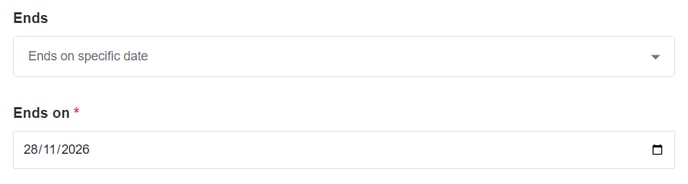 - Select when you'd like your repeat schedule to end, if at all. If you select 'Ends of specific date', a date picker will appear: