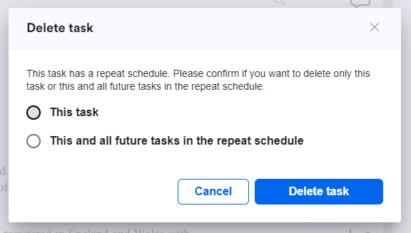 - If the task has a repeat schedule, you'll be asked whether you want to delete this specific task, or the whole schedule:
